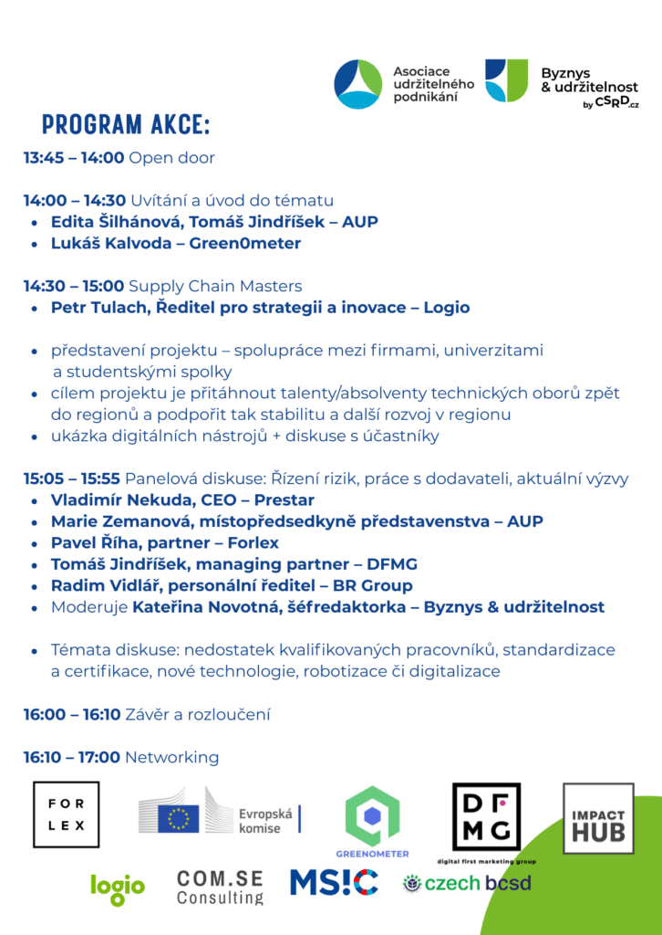 Budoucnost dodavatelských řetězců začíná teď: inovace, odolnost a konkurenceschopnost v praxi. I o tom bude unikátní setkání lídrů a inovátorů nejen z Moravskoslezského kraje, kde se byznys potkává s budoucností. Přijďte zjistit, jak dosáhnout odolnosti svých dodavatelů, jaké nároky budou klást odběratelé v příštích letech a jak mohou moderní technologie, standardy a spolupráce s talenty z regionu posunout vaše podnikání dál. Čekají vás praktické ukázky, otevřená diskuse se špičkami z oboru i prostor pro networking. Buďte u toho, kde vzniká konkurenceschopnost zítřka!